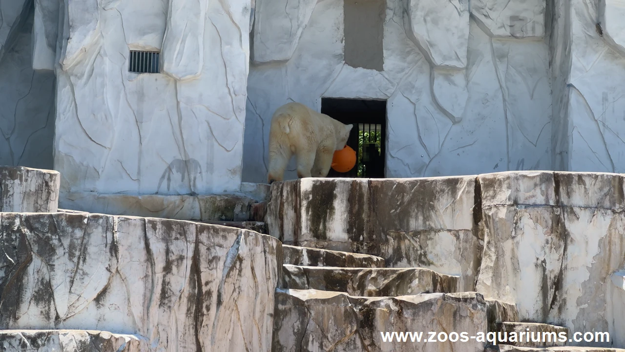 ホッキョクグマのフブキです。お気に入りのボールの遊具を使ってプールの中で遊んでいましたが、最後は口にくわえて屋内エリアのところまで持って行っていました。